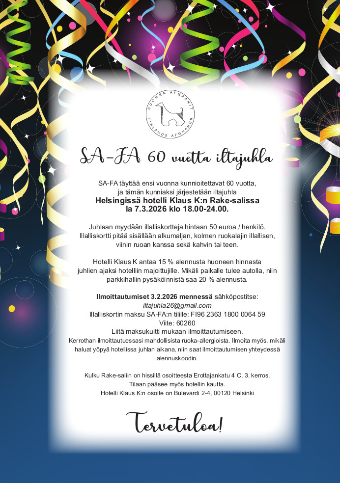 SA-FA 60 vuotta iltajuhla 7.3.2026 18.1.202618.1.2026by SA-FA Kaikki mukaan juhlimaan! Ilmoittautumiset 3.2. mennessä iltajuhla@gmail.com, liitä maksukuitti mukaan ilmoittautumiseen!